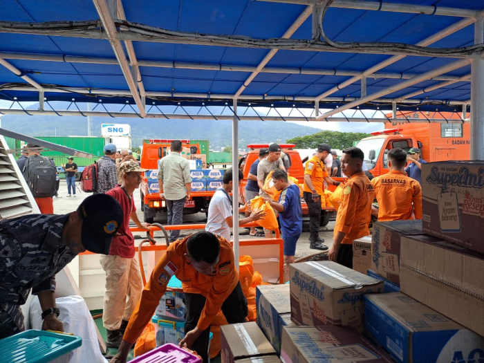 Bantuan berbagai pihak dangkut ke dalam kapal KN Pandudewanata di Pelabuhan Ahmad Yani Ternate. (Foto: Humas Basarnas)